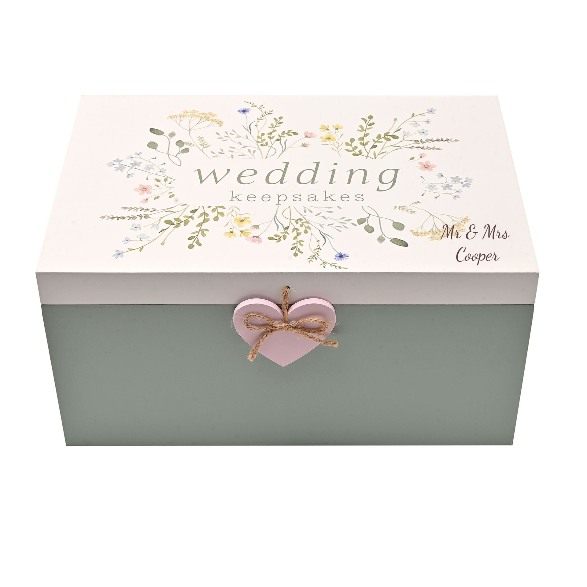 Personalised Love Story Wildflower Wedding Keepsake Box | Wooden Memory Storage Box with Floral Design & Heart Charm | Romantic Gift for Bride, Couple or Newlyweds